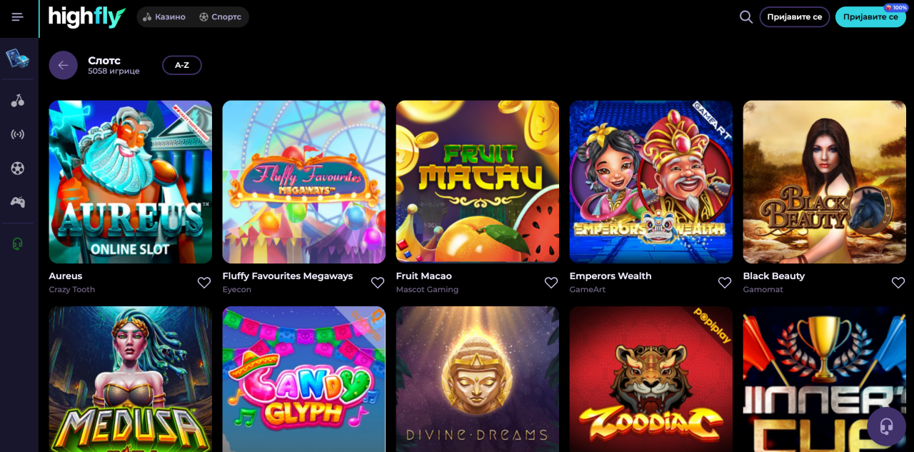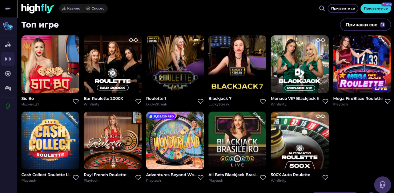 HighFlyBet platforma nudi obiman izbor igara. U kazino sekciji dostupno je hiljade naslova, uključujući slotove, stolne igre i igre uživo, uz konstantno dodavanje novih igara.