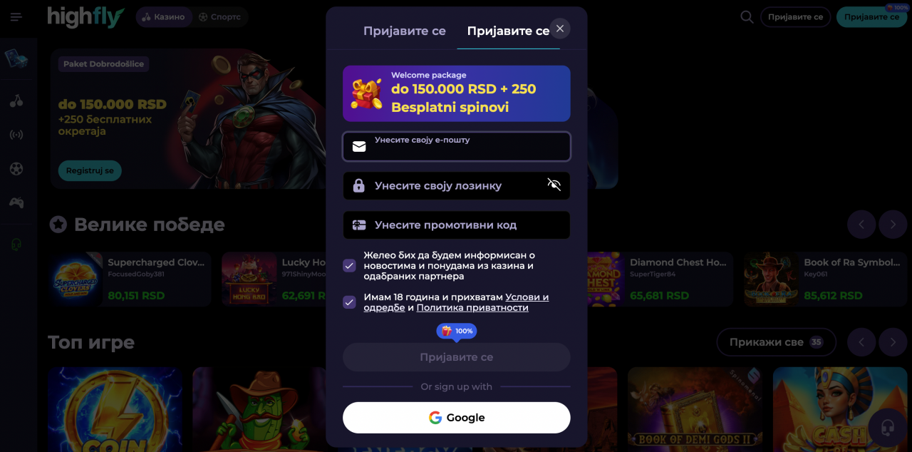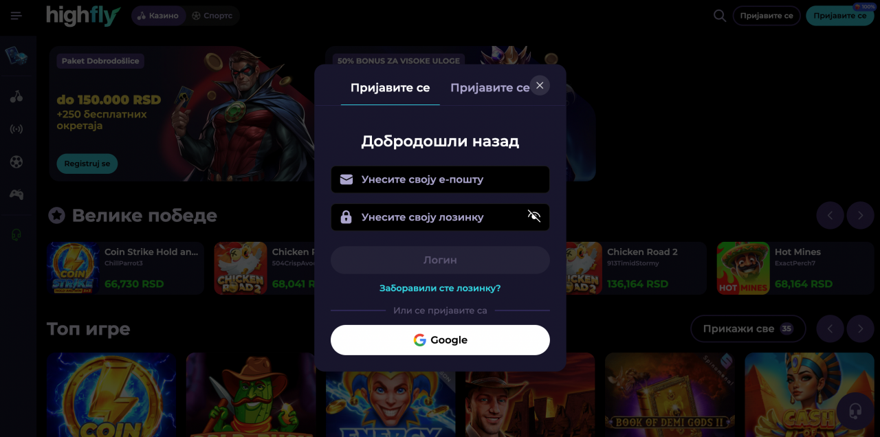 - Prijava: Ulogujte se na svoj HighFlyBet kazino nalog.